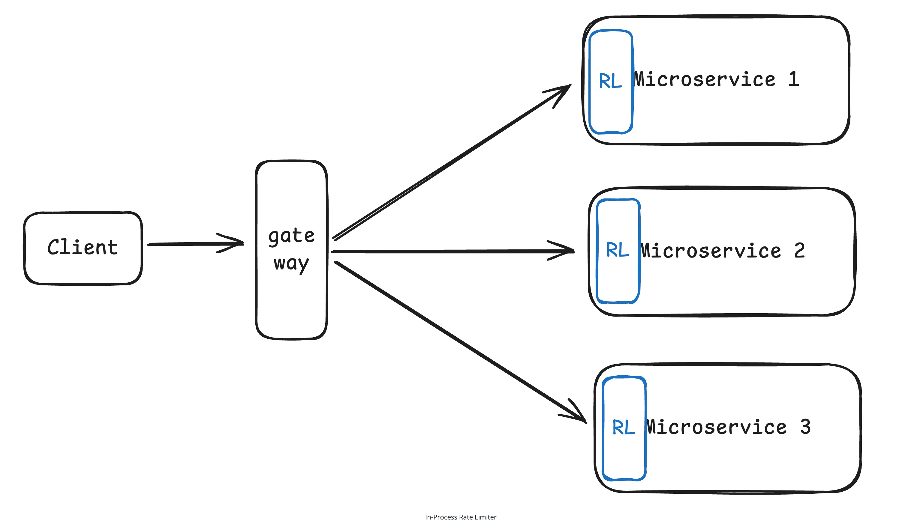Each application server or microservice has rate limiting built directly into the application code. When a request comes in, the server checks its local in-memory counters, updates them, and decides whether to allow or reject the request. This is really fast since everything happens in memory, no network calls, no external dependencies.