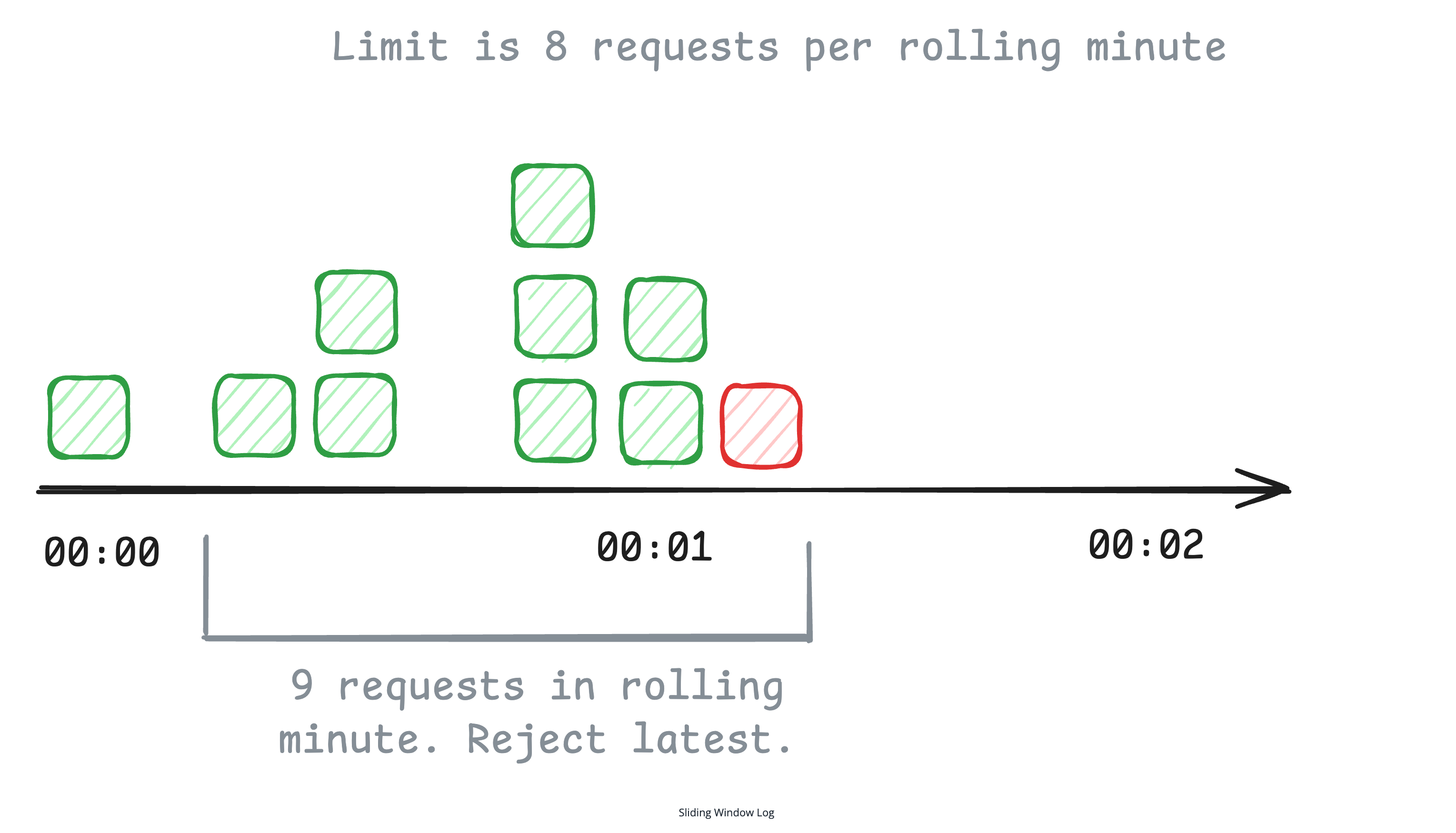 This gives you perfect accuracy. You're always looking at exactly the last N minutes of requests, regardless of when the current request arrives. No boundary effects, no unfair bursts allowed.