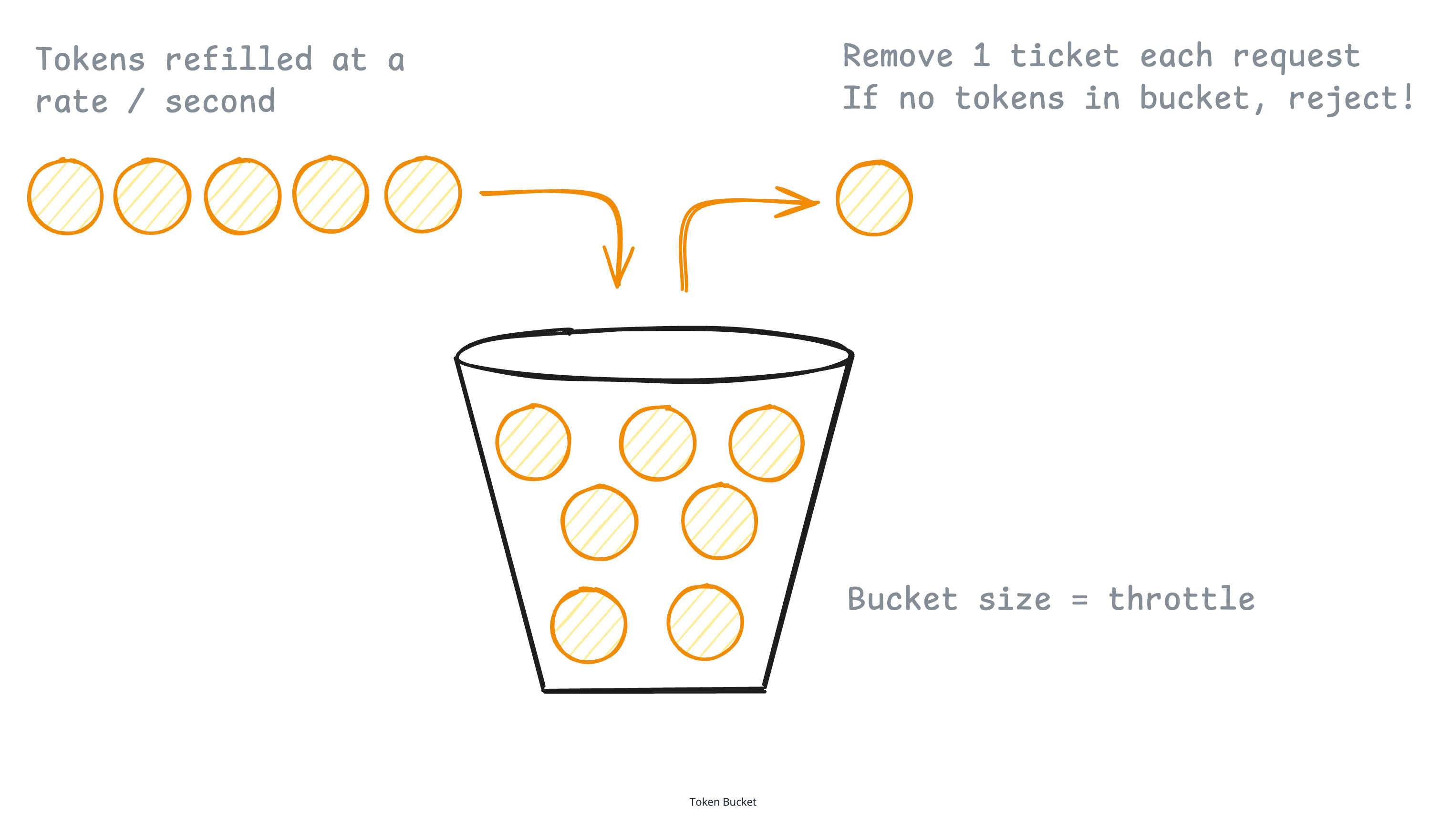 Think of each client having a bucket that can hold a certain number of tokens (the burst capacity). Tokens are added to the bucket at a steady rate (the refill rate). Each request consumes one token. If there are no tokens available, the request is rejected.