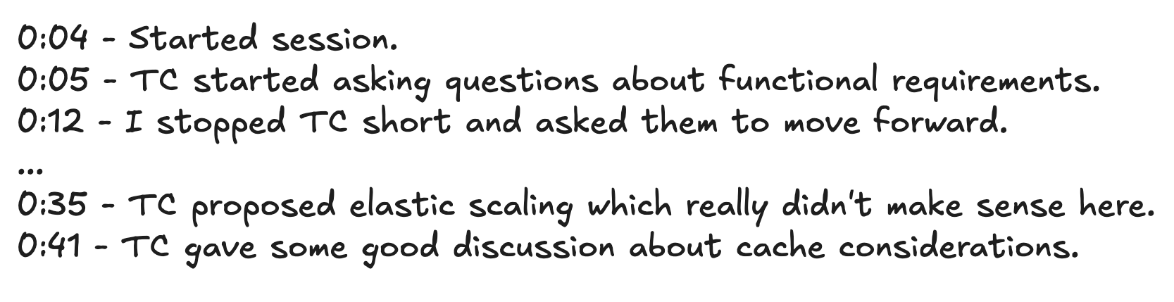 Your interview just ended. Your interviewer is now staring at a form that they need to fill out before moving on with their day. In many cases, they’re going to have a rough transcription of your interview either by writing down the words you’ve said or scratch notes they’ve taken during the interview. It’s popular for interviewers to include timestamps (like “0:05 Candidate started coding...”) to help them remember where you were in the interview and to try to benchmark against other candidates.